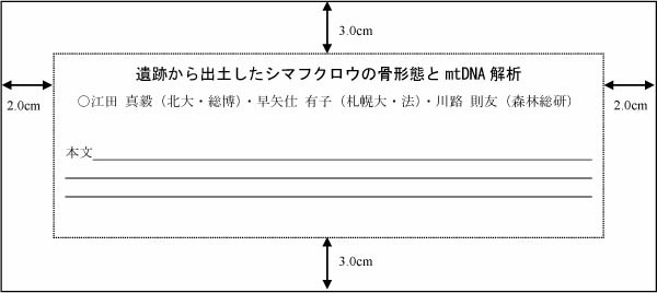 ・最終的にはB5版に縮小コピーして要旨集とすることを考慮して、文字サイズ・レイアウトをお決めください。図表も使用できますがきれいに刷り上がらない場合があります。